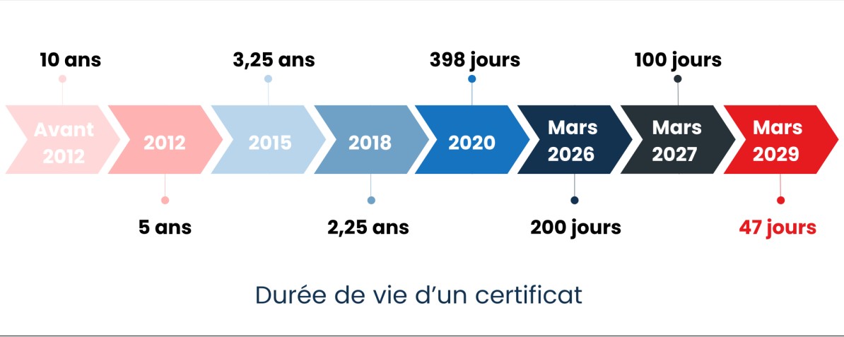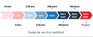 L’objectif est de améliorer la sécurité globale des certificats : des durées plus courtes réduisent le risque qu’un certificat obsolète ou compromis reste actif trop longtemps. Parallèlement, cela renforce la nécessité de solutions automatisées pour la gestion des renouvellements, car une validation manuelle deviendrait trop lourde à maintenir.