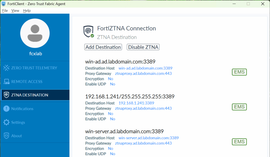 - Un serveur LAN : win-server.ad.labdomain.com, accessible via ZTNA, ainsi qu’un serveur win-ad.ad.labdomain.com, utilisé uniquement pour la démonstration.