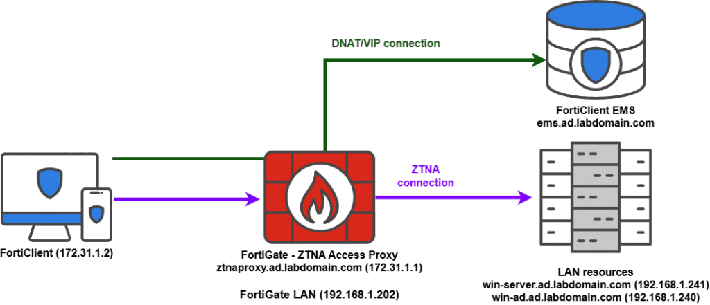 - Un FortiGate jouant le rôle de proxy d’accès ZTNA : ztnaproxy.ad.labdomain.com ;