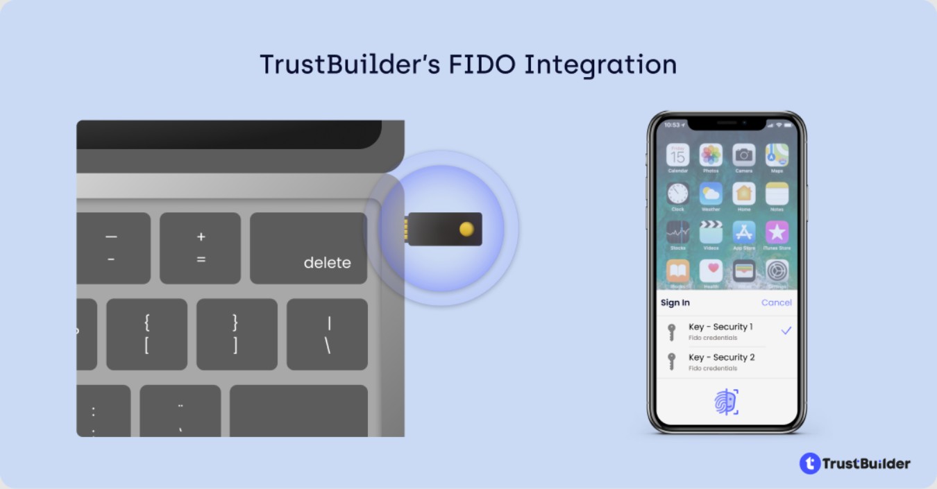 Avec l’intégration de FIDO, TrustBuilder propose une large gamme de méthodes pour authentifier vos utilisateurs. En plus de TrustBuilder Authenticator – disponible sur mobile, desktop et token navigateur – , vous pouvez désormais utiliser des clés de sécurité physiques (comme les YubiKeys) ou adopter des solutions sans mot de passe, telles que les systèmes d’authentification intégrés aux plateformes (comme Windows Hello), toutes conformes aux standards FIDO.